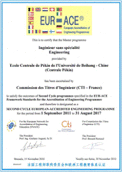 Les dirigeants successifs de l’Université Beihang ont tousattaché une grande importance à l’évaluation de la CTI, l’académicien HuaiJinpeng ainsi que le Président de l’université Xu Huibin ont rencontré lesmembres de l’équipe d’évaluation de la CTI pour comprendre le processus et lesnormes d’évaluation. Grâce aux multiples efforts de l’université et de l’École,Centrale Pékin est devenue le premier établissement chinois à être accréditépar la CTI pour délivrer le diplôme d’ingénieur (avec le label EUR-ACE). Et en2016, l’accréditation a été renouvelée avec succès pour 6 ans.