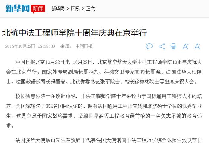 Le 22 octobre,le 10eanniversaire de la fondation de l’École centrale de Pékin aété fêté à Pékin. M. XIA Mingjiu, vice-directeur de l'Administration d'État desaffaires des experts étrangers, M. XIA Biao, directeur du département en chargedes experts étrangers dans les domaines culturel et éducatif, M. MauriceGOURDAULT-MONTAGNE, ambassadeur de France en Chine, M. ZHANG Jun, académicienet chef du comité du Parti communiste chinois de Beihang et M. XU Huibin,académicien et président de Beihang ont été présents à la cérémonie.